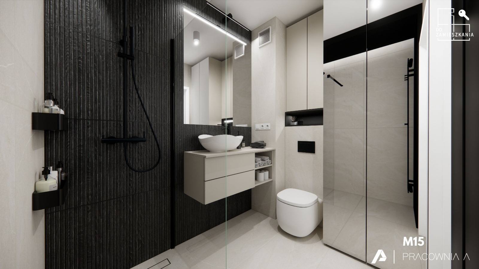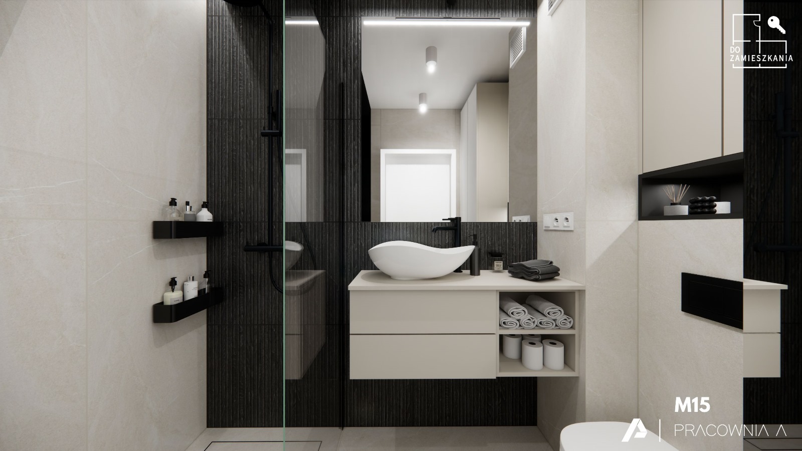 - Łazienka: Szafka, umywalka, toaleta, prysznic