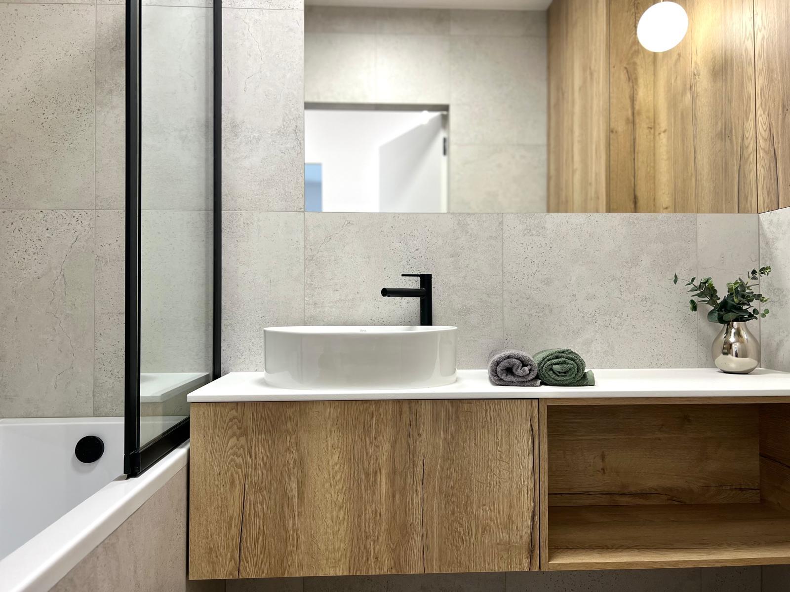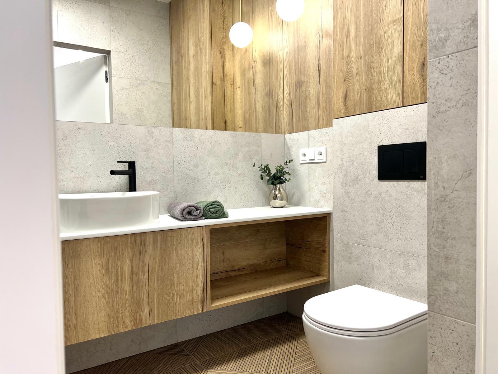 W łazience znajduje się nowoczesna zabudowa oraz pełen zestaw wyposażenia sanitarnego a na pralkę mamy przeznaczone oddzielne wentylowane pomieszczenie.